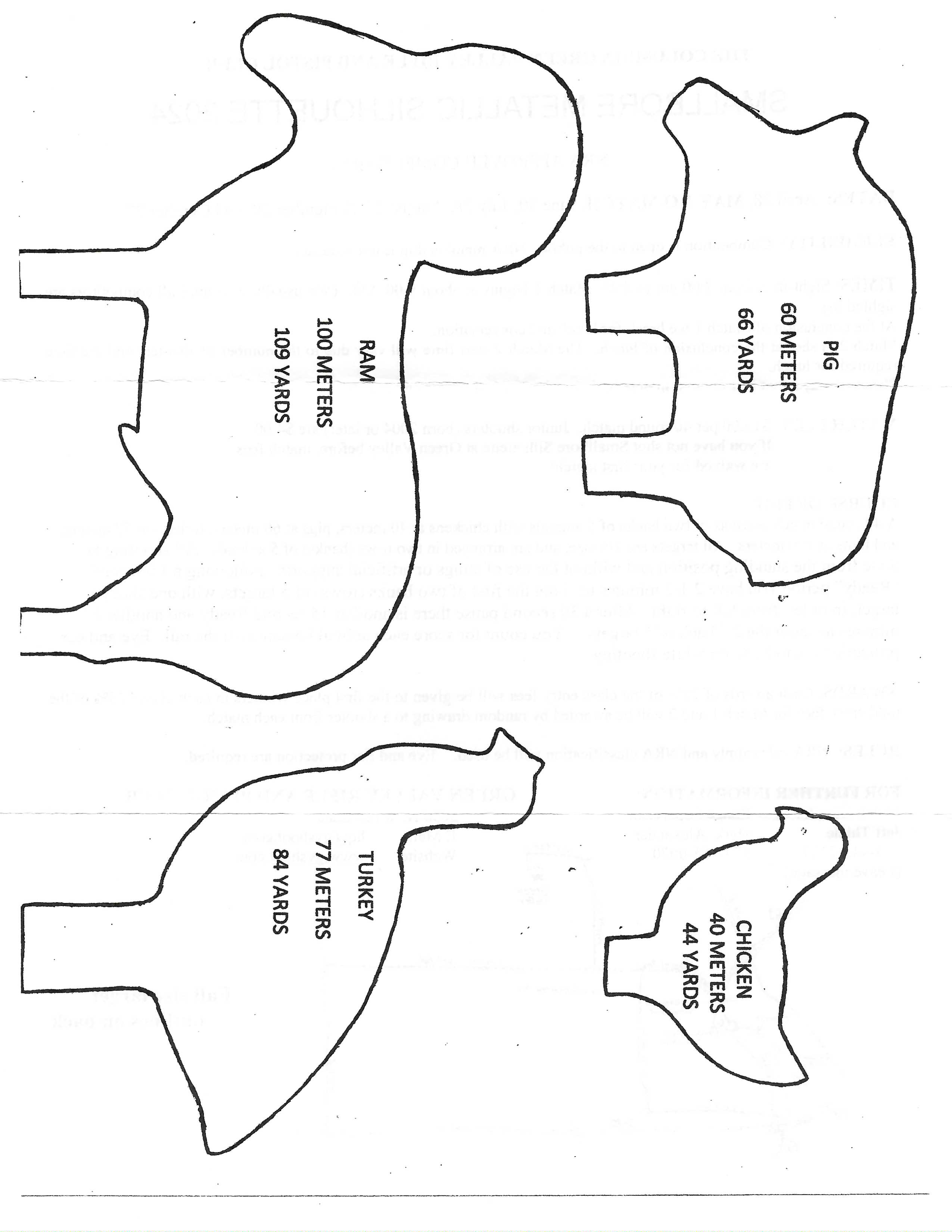 DATES: April 22, May 12, June 24, July 29, August 26, September 23, October 28 LOCATION: Columbia Rifle Range.ELIGIBILITY: Competition is open to the public. NRA membership is not required. TIMES: Sight-in from 8:00 am to 8:45. Match begins at 9:00 am MATCH FEES: $10.00 per 40 round match. Junior shooters (born 1998 or later) are $4.00. If you have not shot Small bore Silhouette at Green Valley before, match fees are waived for your first match! COURSE OF FIRE: Two 40 round matches, with a break in between for lunch. Matches can be shot in the morning, after lunch, or both. A 40 round match consists of 10 rounds total at each of the four animals: chickens at 40 meters, pigs at 60 meters, turkeys at 77 meters, and rams at 100 meters All targets are 1/5 size. AWARDS: Cash awards will be given to the first place winners in each class. 50% of the entry fee will be returned as cash awards or drawings... RULES: NRA rules apply and NRA classification will be used. NRA scorebooks are required and will be available. (A once per year purchase of $13.00). "Artificial support" rules and regulations will be enforced. Eye and Ear protection are required. ADDITIONAL INFORMATION: PRACTICE TARGETS: